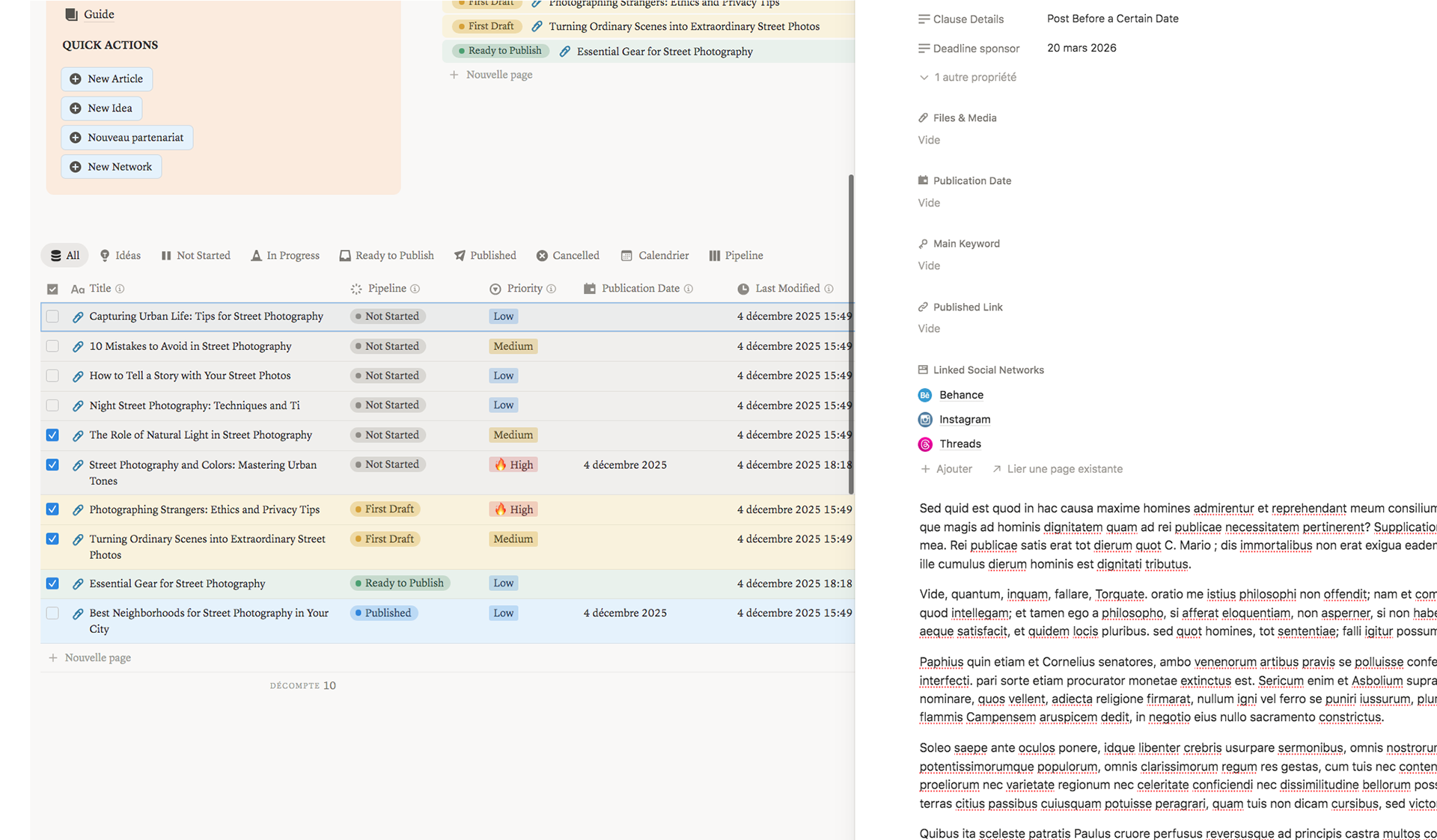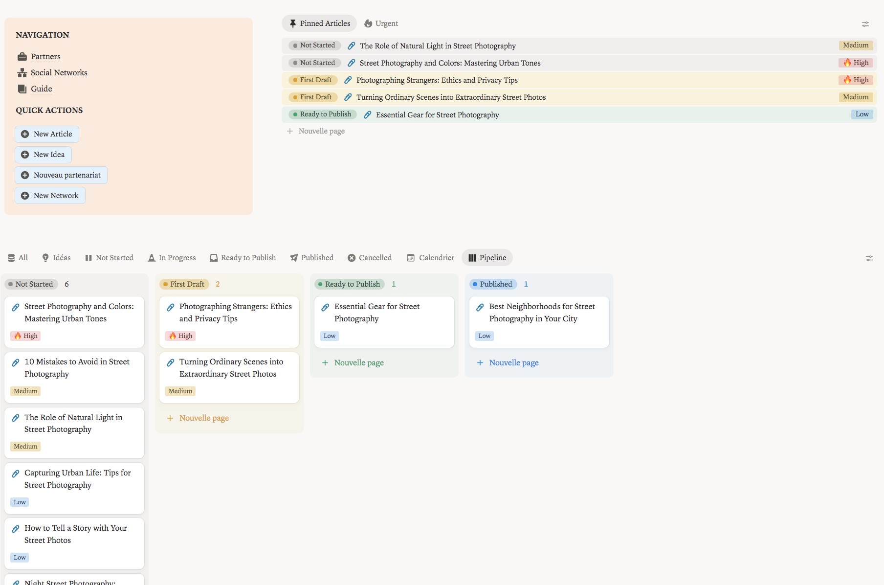 En tant que photographe et créateur, je publie sur plusieurs plateformes. J’avais besoin d’un système simple, fluide et visuel pour gérer mes idées, mes drafts et mes publications.